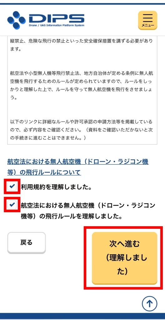 スクロール後、チェックを入れ、「次へ進む(理解しました)」ボタンを押します。
